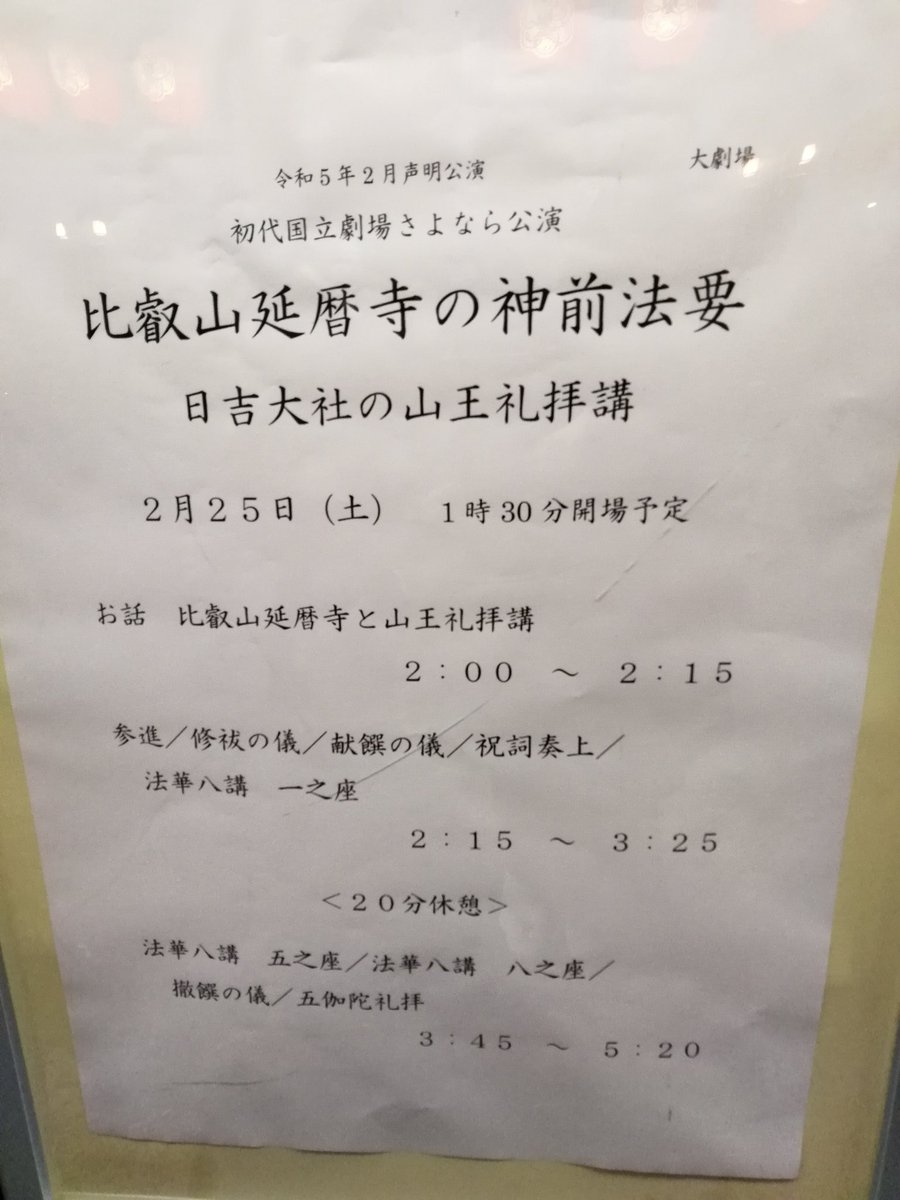 昨日は国立劇場で行われた「比叡山延暦寺の神前法要 日吉大社の山王礼拝講」を観に行った。僧侶が山王権現の神前で、法華経の功徳を問答形式で、声明によって献じるもので、貴重なものを観ることができた。 https://t.co/ThvNrM3Kdy
