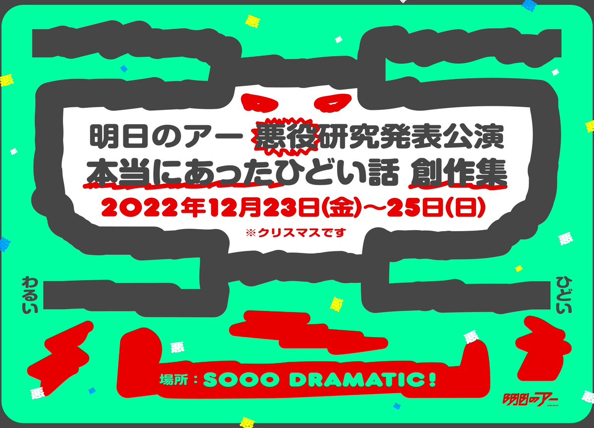 【当日券情報】 23日19時開場の当日券は、この後18:20から受付開始します。暖かい格好でお越しください。 明日のアー 悪役研究発表公演『本当にあったひどい話 創作集』 会場:SOOO dramatic! (〒110-00… https://t.co/Lj6D4YWdM9