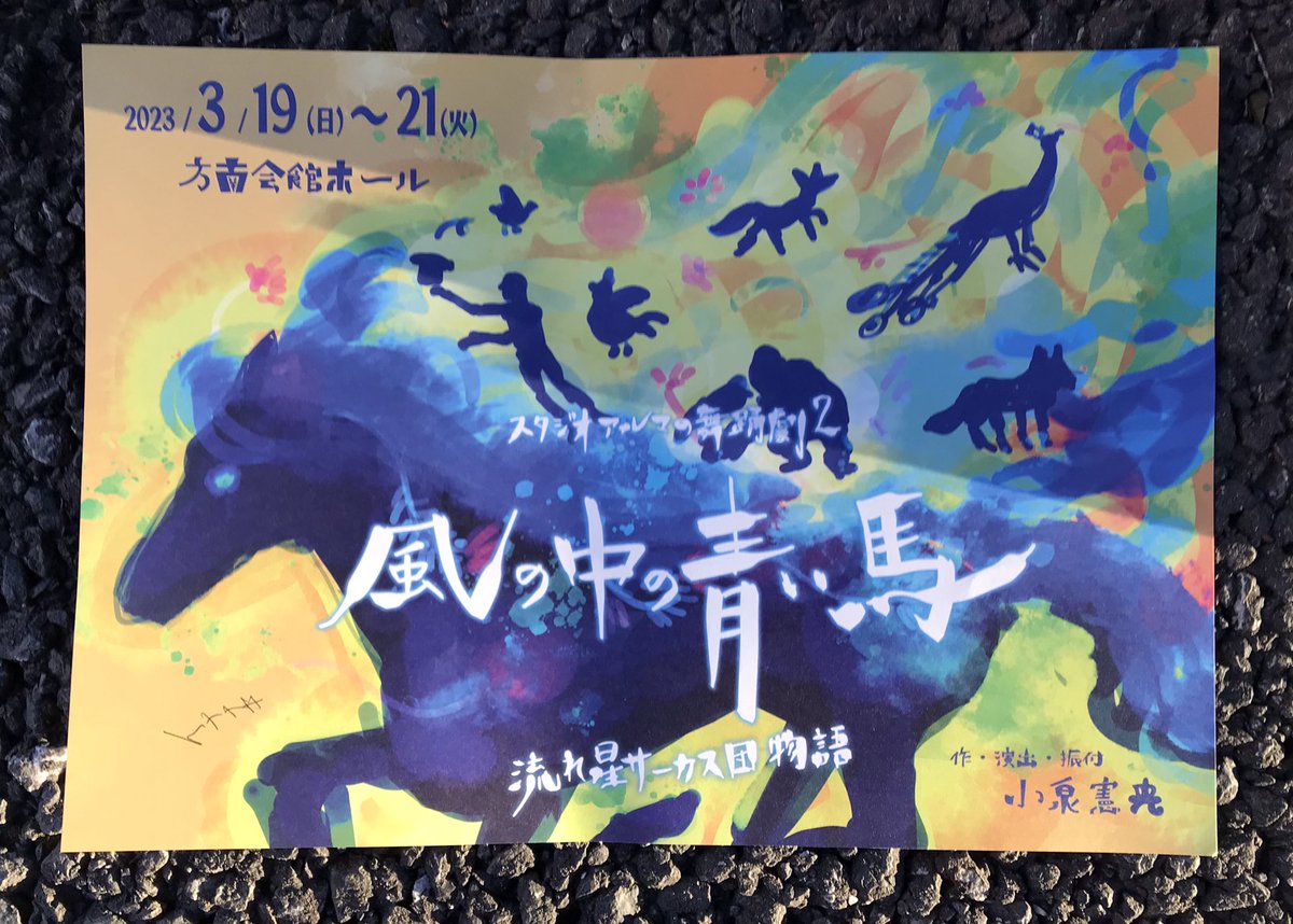 方南会館ホールで小泉憲央・作/演出/振付の舞踏劇『風の中の青い馬——流れ星サーカス団物語』を観た。音楽は米内山尚人、絵は皿うどん。馬の嘶きが良かった。 https://t.co/B1SuOHvLS4