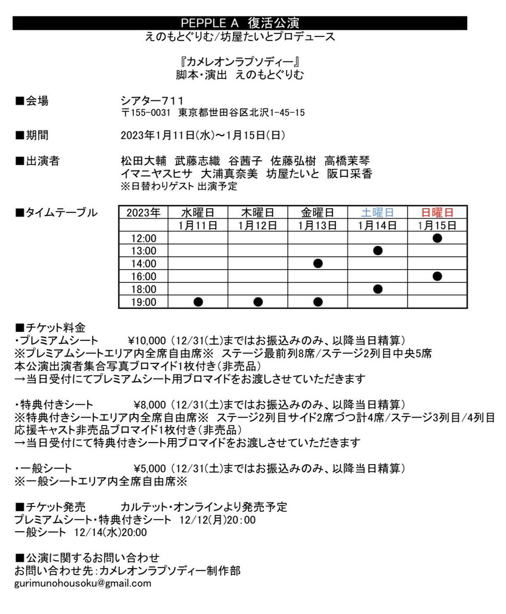 今週のシアター711 えのもとぐりむ/坊屋たいとプロデュース公演 カメレオンラプソディー 2023年1月11日(水)~1月15日(日) 作・演出 えのもとぐりむ プレミアムシート ¥10,000 特典付きシート ¥8,0… https://t.co/MYafMsONNM
