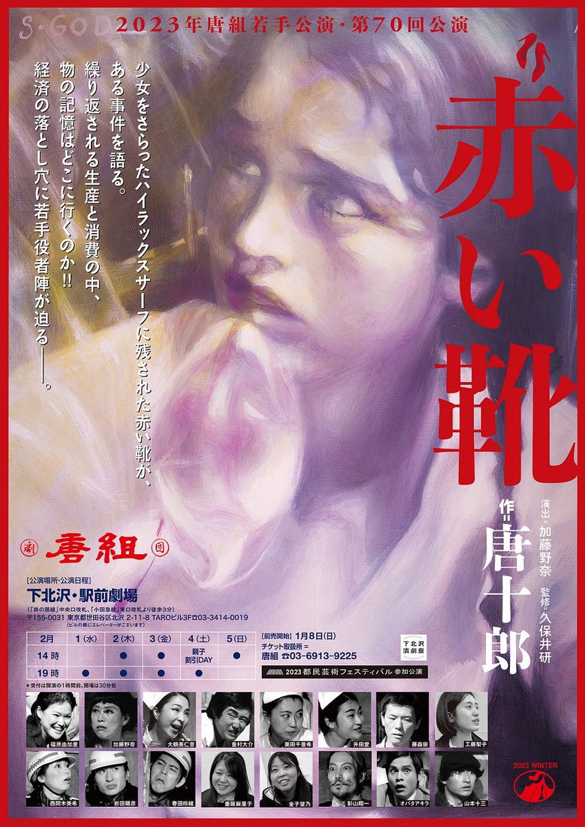 唐組若手公演・第70回公演『赤い靴』 本日2月1日(水)~5日(日)下北沢・駅前劇場にて公演! 作:唐十郎 演出:加藤野奈 監修:久保井研 出演:福原由加里 大鶴美仁音 ほか 劇団唐組の皆さんへのインタビューも掲載。… https://t.co/sXM7tNbeZp