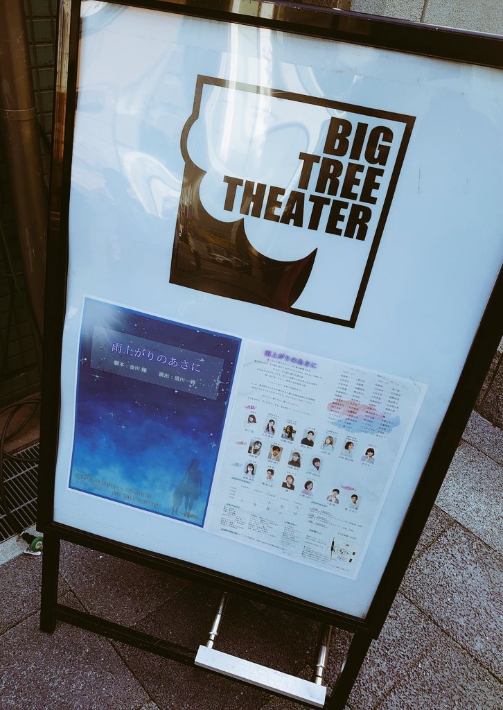 今日は池袋BIG TREE THEATERで「雨上がりのあさに」観劇。お話は良くできていて、始めに思ってた時間軸より未来に行くとは思わず、まなふぃーの途中のセリフ(呼びかけ)で驚いた。ただ、本質じゃないけど、細部の説明不足と言うか… https://t.co/JvFrJFja5d