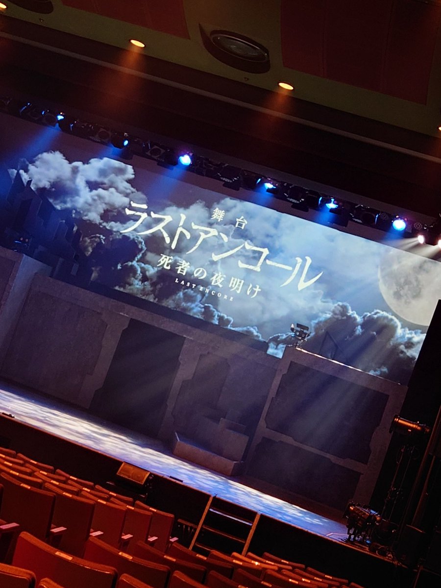 そしてこちらの舞台「ラストアンコール~死者の夜明け~」も拝見いたしました。演出おもしろくて興味深かったです。映像と照明のバランスがとても綺麗。アクションもっと観たかったな…! (場内ポスターと上演前舞台上は撮影〇でした) https://t.co/QealZk5qC9