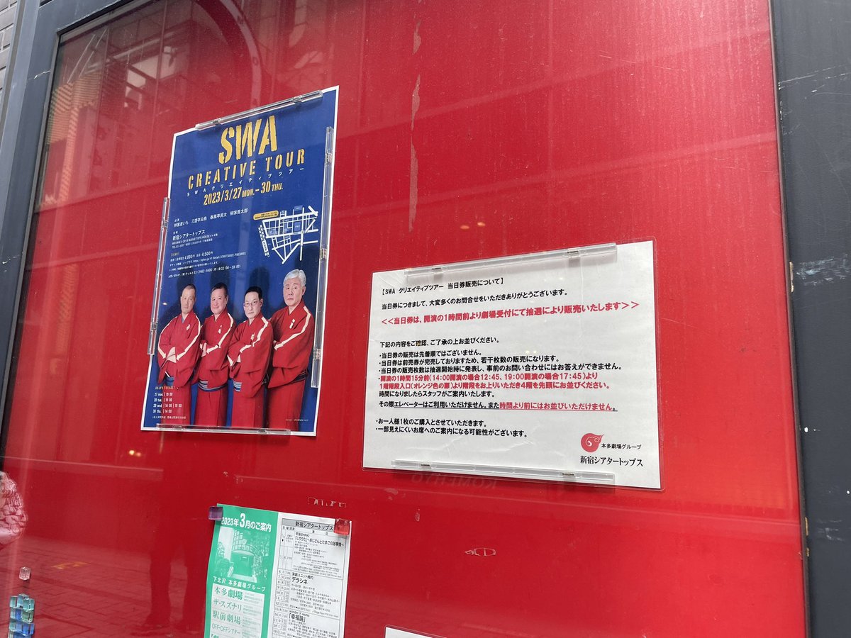 「SWAクリエイティブツアー」新宿シアタートップス、当日券。 共通テーマで4人の個性を活かした作品の数々。楽しかったです。 当日券は初日ハズレ、2日目でアタリ。キャンセル待ち入れて10人前後。初日30人強、2日目は17人で抽選。倍… https://t.co/oIQ3A0VRSL