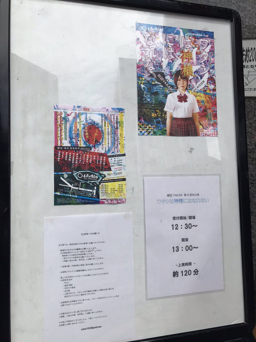 明日でいよいよお終いです。 僅かではありますがチケットご用意可能です。 劇団YAKAN 第4回本公演 『ワタシは神様にはなれない』 @王子小劇場 4/23(日)13:00/17:00 https://t.co/hIPqbr0j7s #ワタカミ