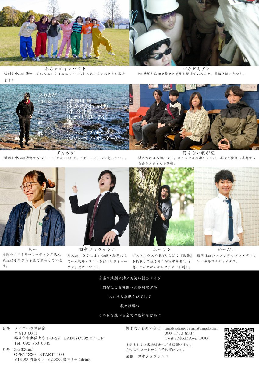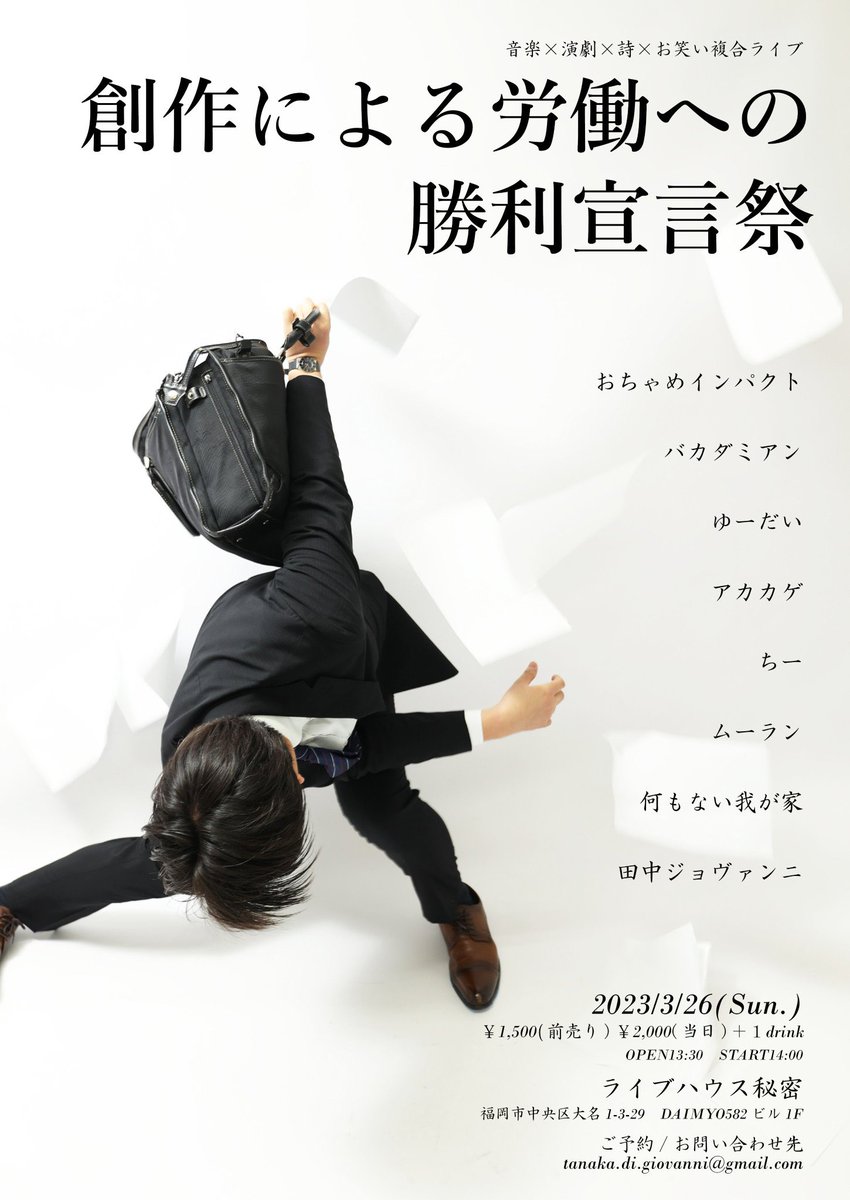 - ̗̀📢明日の複合ライブのお知らせ- ̗̀📢 「創作による労働への勝利宣言祭」 【日時】3/26(日)13時半開場,14時開演 【場所】福岡大名ライブハウス「秘密」 おちゃめインパクトからはらいむさんと私の2名で出演させて… https://t.co/fdPBa4hT5i