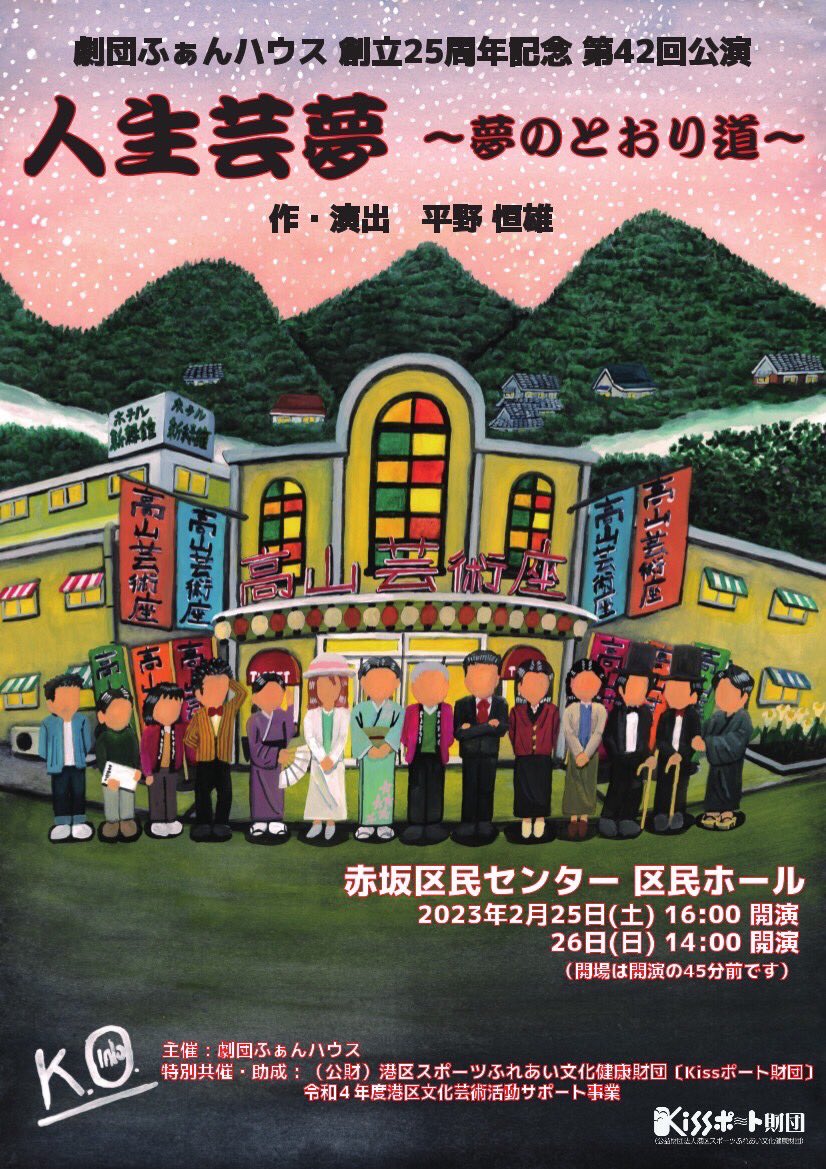 【宣伝】 当方が公演チラシを描かせて頂いた、 劇団ふぁんハウスさんの舞台「劇団ふぁんハウス 第42回公演「人生芸夢 ~夢のとおり道~」」、 2月25日・26日に東京都港区の赤坂区民センターにて上演となります。 公演についての詳細は… https://t.co/krsD7lLUFk