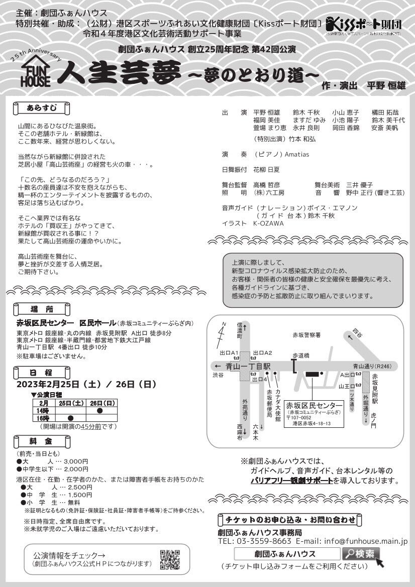 【宣伝】 劇団ふぁんハウスさんの舞台「劇団ふぁんハウス 第42回公演「人生芸夢 ~夢のとおり道~」」、 いよいよ明日の2月25日(土)、 そして明後日26日(日)に 東京都港区の赤坂区民センターにて上演となります。 公演についての… https://t.co/eHj2mkfLAS