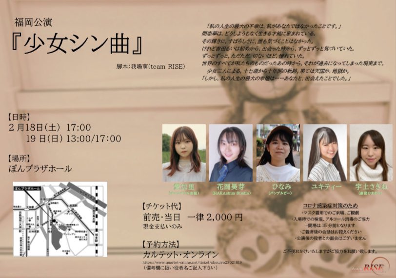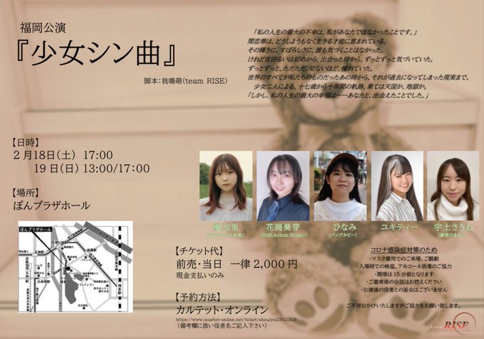 【本日(2/18)の公演情報】 team RISE 『少女シン曲』 開場 16:45 開演 17:00 当日券ございます。 直接4階ホールへお越しください。 https://t.co/Y024jF2pwL
