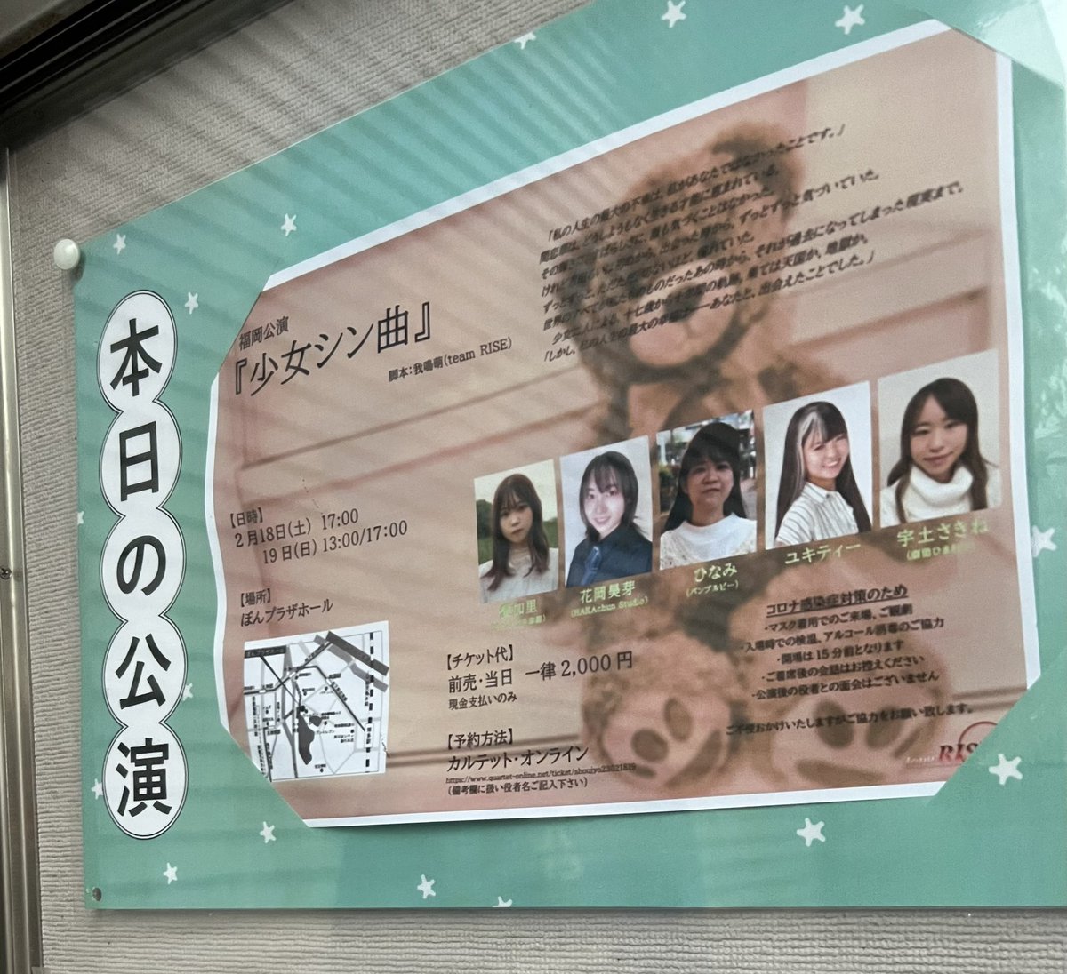 福岡公演「少女シン曲」 本日13時からと17時からです❣️ 当日チケットもありますので少しでも興味ある方!!ぜひお越しください!!!🥺 場所はぽんプラザホールです🥰 https://t.co/swJplYvFJq
