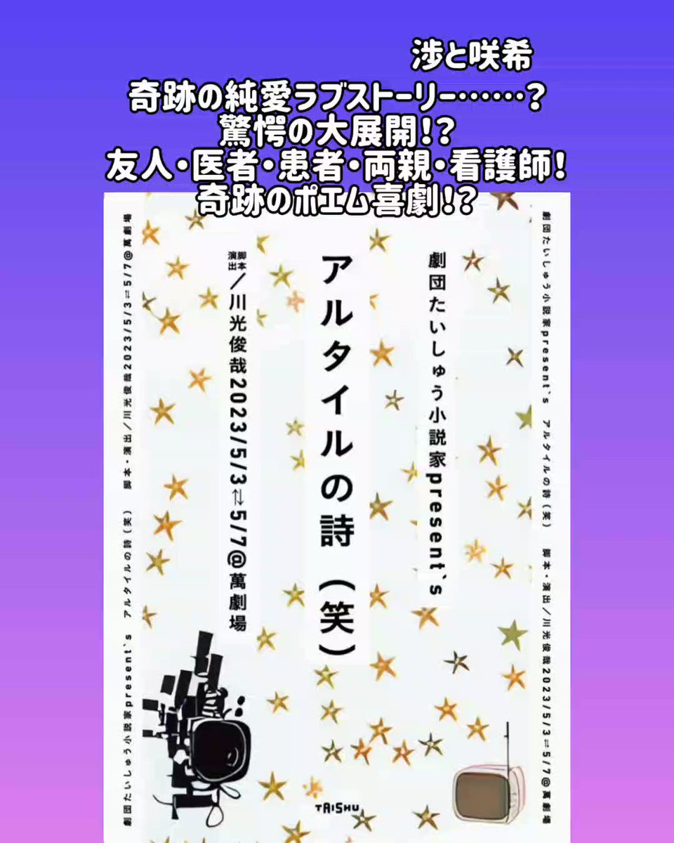 7. 劇団たいしゅう小説家present`s 「アルタイルの詩(笑)」 終演しました!! ご来場頂きまして本当にありがとうございます! 自分の中でも色々と挑戦の舞台でした! GWの思い出として少しでも記憶に残って頂けると幸いです! https://t.co/CgSNbQbypb