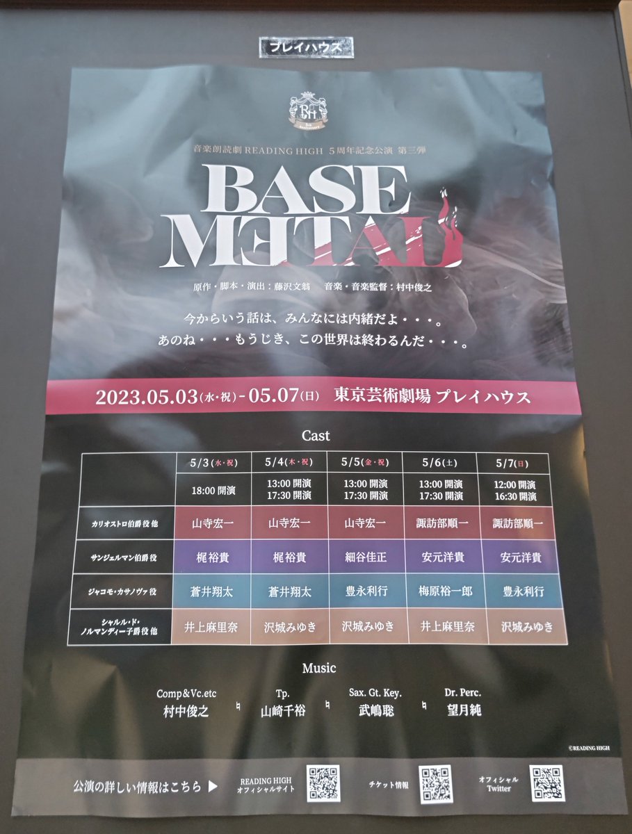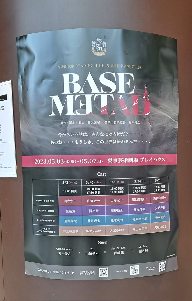 音楽朗読劇 READING HIGH『BASE METAL』/2023.5.7夜 芸劇プレイハウス前方センブロ。映像化や配信は無いと聞いていたので心して観劇しましたよ😌良いお声と演奏を浴びて心が満たされた~☺️リーフレット入りクリ… https://t.co/2oJYhz39Dv