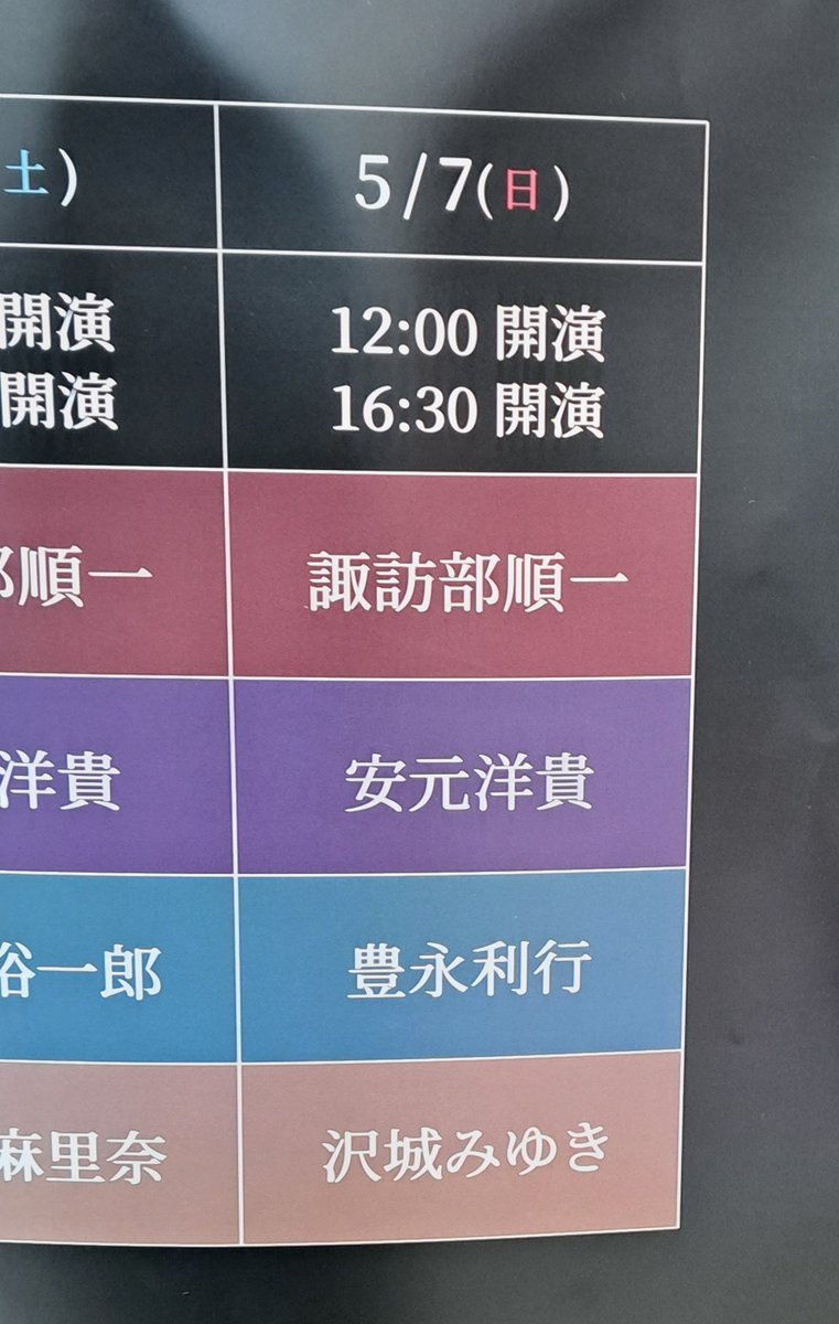 | タイムテーブル | 5月3日(水) 18:00 5月4日(木) 13:00 / 17:30 5月5日(金) 13:00 / 17:30 5月6日(土) 13:00 / 17:30 5月7日(日) 12:00 / 16:30 |