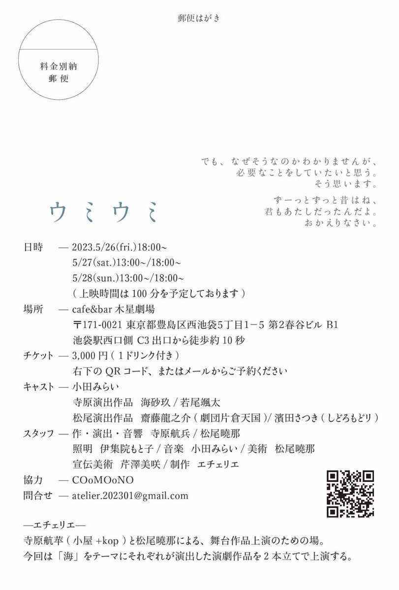 | スタッフ | 【作・演出・音響】寺原航兵/松尾曉那 【照明】伊集院もと子 【音楽】小田みらい 【美術】松尾曉那 【宣伝美術】芹澤美咲 【制作】エチェリエ |