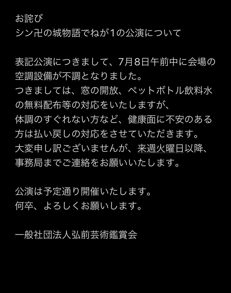 お詫び シン卍の城物語でねが1の公演について 表記公演につきまして、7月8日午前中に会場の空調設備が不調となりました。つきましては、窓の開放、ペットボトル飲料水の無料配布等の対応をいたしますが、体調のすぐれない方など、健康面に不安… https://t.co/6jfznL3I89