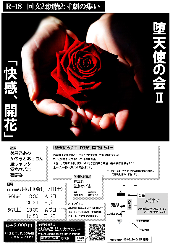 | 説明 | 堕天使の会Ⅱ 『快感、開花』 とは… 昨年師走に初の試みとしてひっそりと催され、 大好評をいただいたちょっと知的な(※) 下ネタイベントの第2回。 今回は、美津乃あわ、緑ファンタによる官能的な朗読、さらに映像作品もまじえ、 堂々グレードアップしての再登場です。 ※…とはいえ決して気取っているわけではありません。気分は永遠の中学生、です。 |