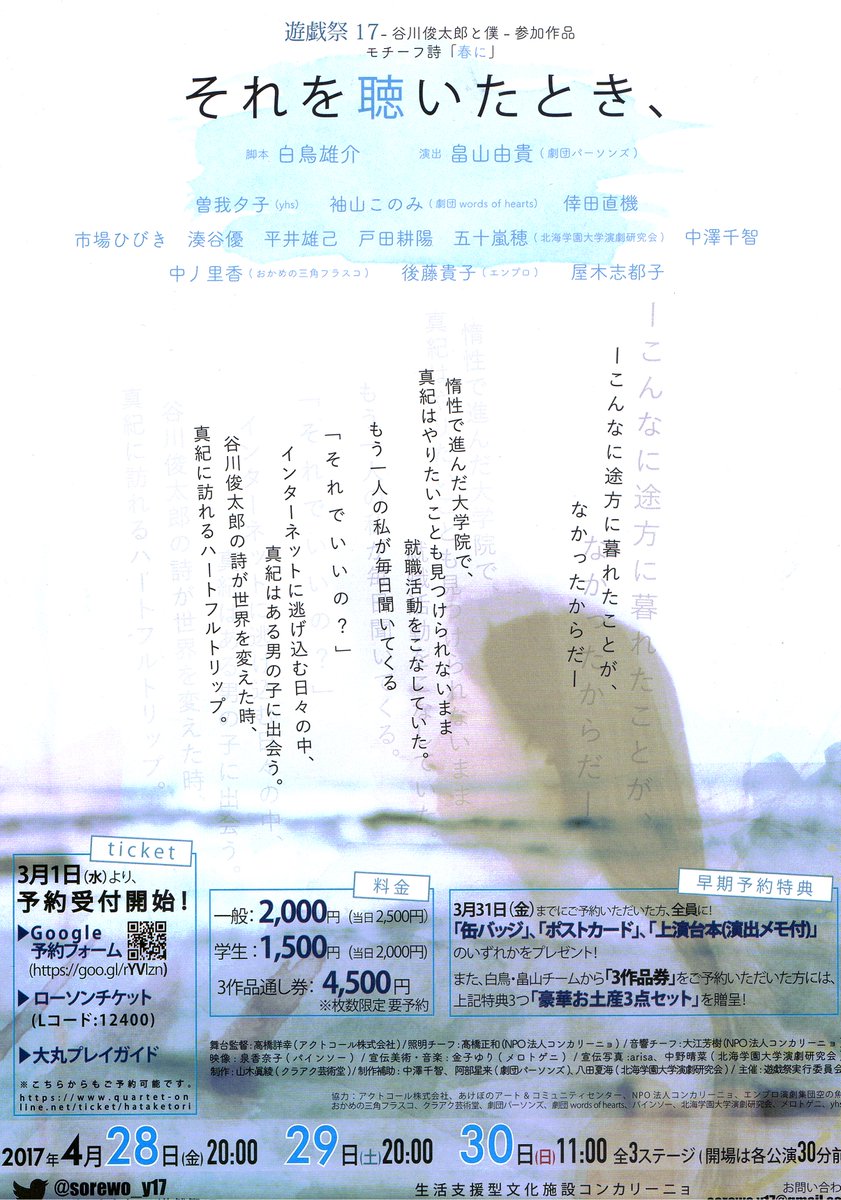 遊戯祭17-谷川俊太郎と僕ー参加作品 モチーフ詩「春に」 『それを聴いたとき―こんなに途方に暮れたことが、なかったからだ。』 4月28日(金)~30日(日) 脚本:白鳥雄介、演出:畠山由貴 コンカリーニョ/琴似 一般前売2000円 https://t.co/D35LCJQV8J