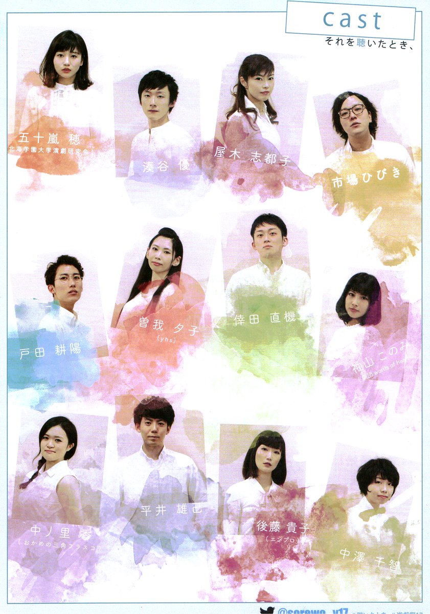 | 出演 | 曽我夕子(yhs)、湊谷優、袖山このみ(劇団wordsofhearts)、倖田直機(実験演劇集団風蝕異人街)、市場ひびき、平井雄己、五十嵐穂(北海学園大学演劇研究会)、戸田耕陽、中澤千智、中ノ里香(おかめの三角フラスコ)、後藤貴子(エンプロ)、屋木志都子 |