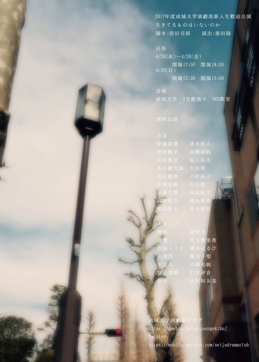 ついに明日から新入生歓迎公演「生きてるものはいないのか」が上演されます!全4公演ありますのでお時間のある方、芝居に興味のある方などぜひお越しください😊 https://t.co/XhKLM7q1MS #春から成城 #成城大学 #成城演劇