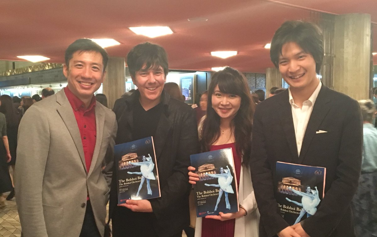 終演後、鑑賞に来ていた演奏家チームと記念撮影!指揮の海老原さん、ピアノの萩原さんとヴァイオリンの成田さん、皆仲良しです! @japan_arts https://t.co/PBy1hZsm7v #ボリショイバレエ #パリの炎