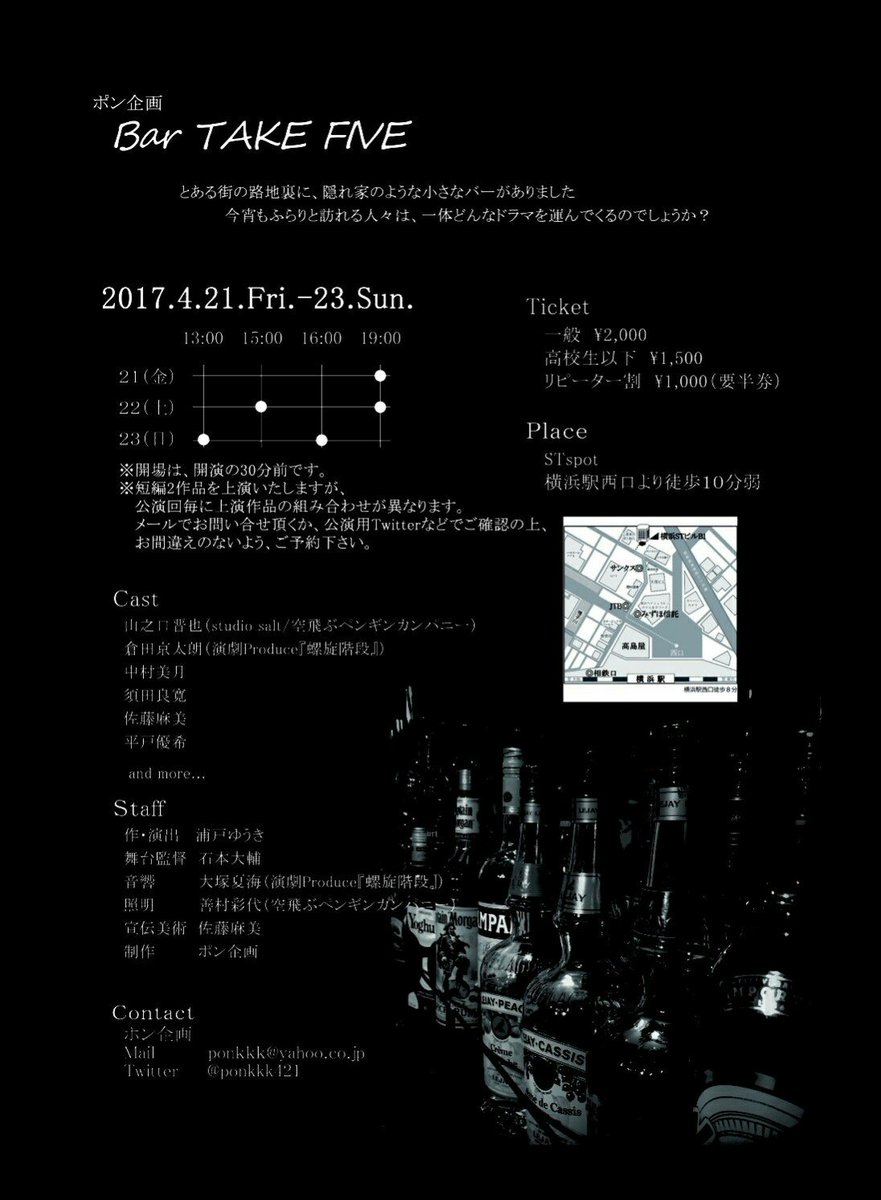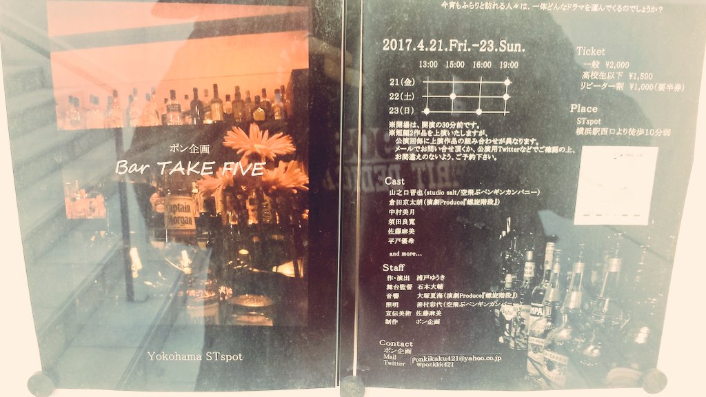 ポン企画 「Bar TAKE FIVE」 作・演出 浦戸ゆうき 【日時】 2017年4月 21(金)19:00(AD) 22(土)15:00(AB)/19:00(CD) 23(日)13:00(BC)/16:00(シークレット)… https://t.co/2iytDr9iTe