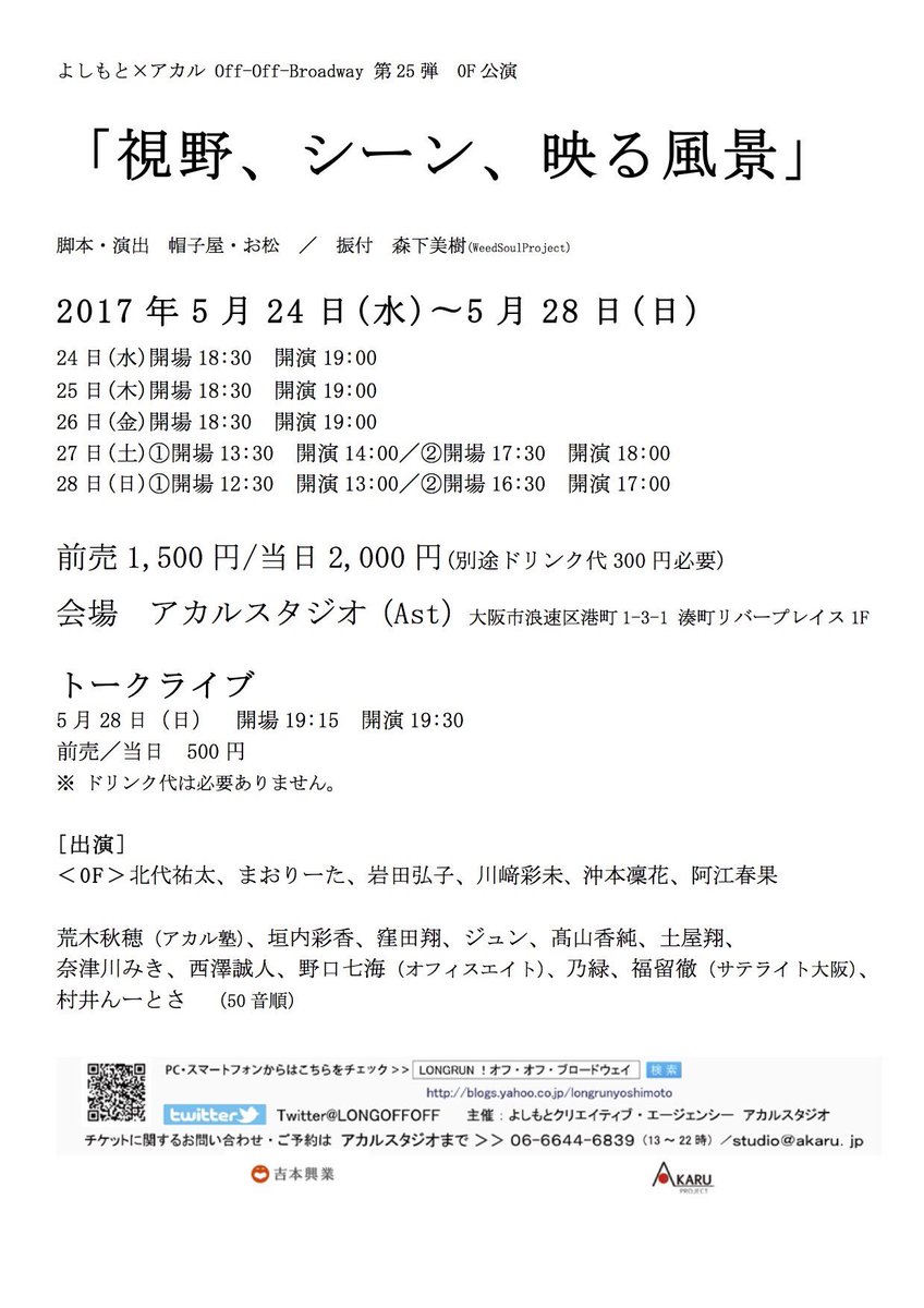 【次回公演情報 大解禁!!】 第25弾『視野、シーン、映る風景』の出演者が決定しました! 日程は5月24日(水)〜28日(日) 計7公演とトークライブも開催! 前売チケット1500円のご予約はアカルスタジオ、出演者までお問い合… https://t.co/bskGXM90Cn