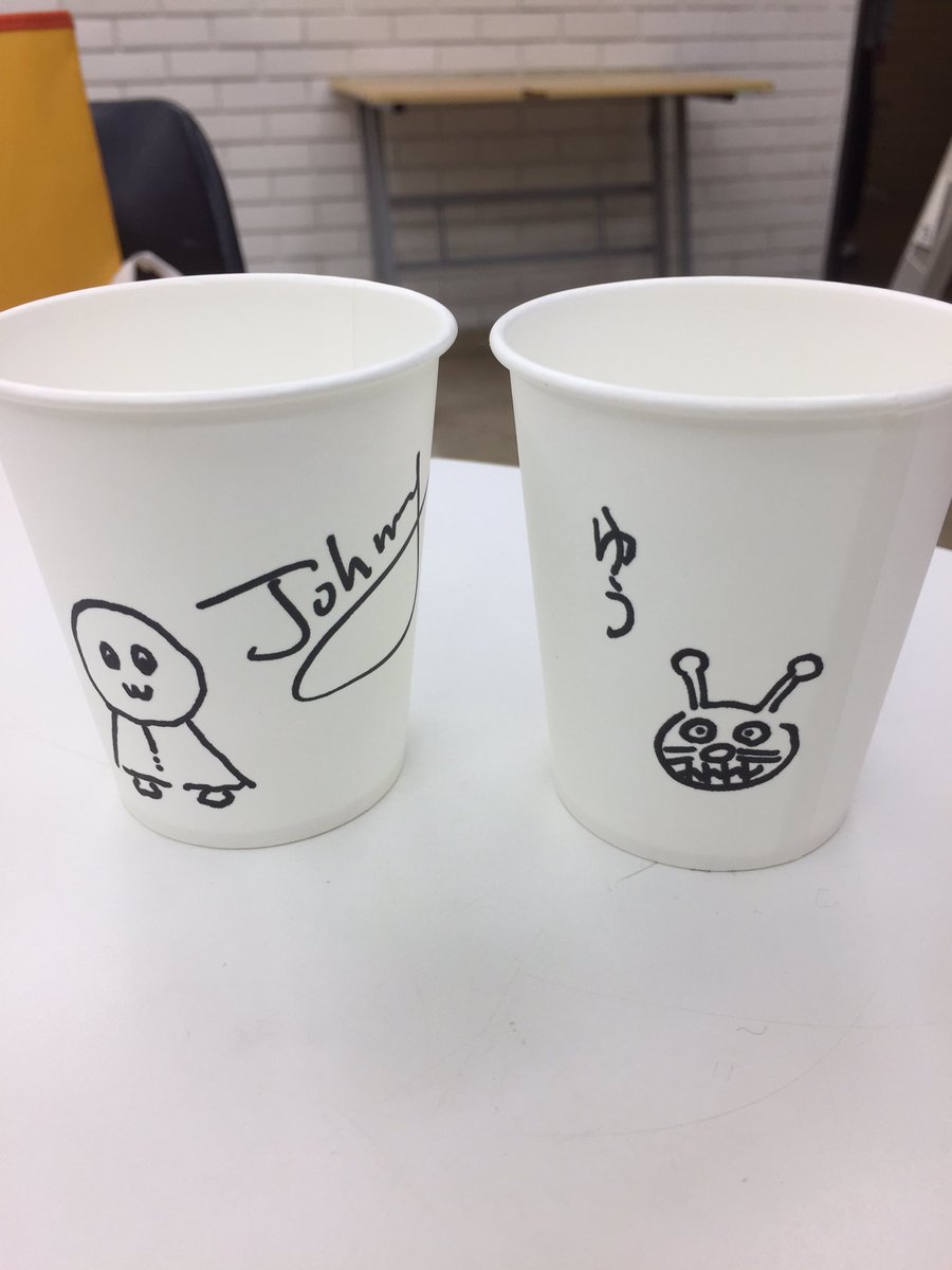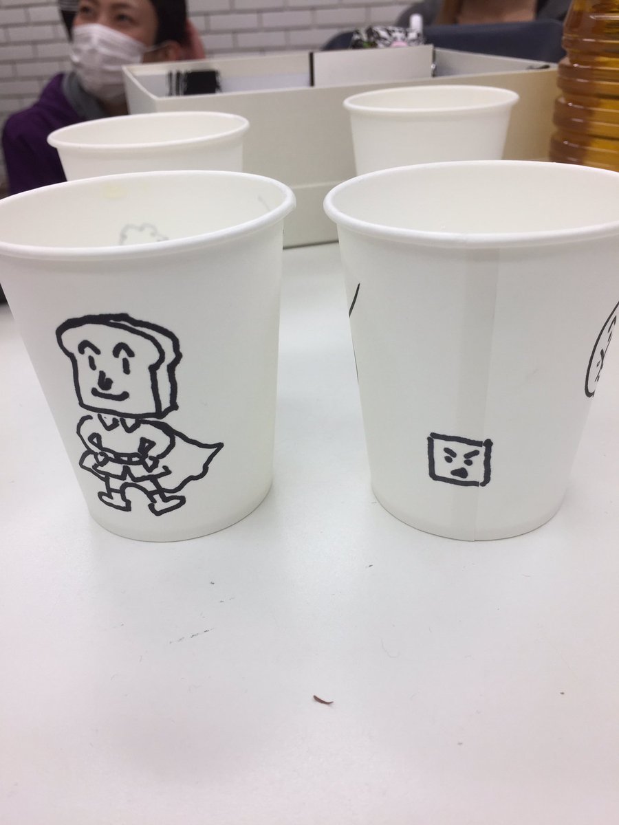 オフィス再生 『正義の人びと』 六本木ストライプスペースにて 仕込み中 休憩場で 紙コップに記憶だけでアンパンマンのキャラクターを描けるか大会が始まりました 主宰の高木(Johny)氏は アンパンマンを描いたそうです(左) https://t.co/zcqFpoUTnl