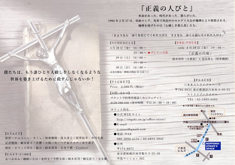| スタッフ | 原作:アルベール・カミュ 照準機関:髙木尋士 照準助手:市川未来 記述機関:鶴見直斗 音響:大和二矢 ヘアメイク:木下恭子 制作:オフィス再生 協力:鈴木邦男・吉本千穂・Confetti |