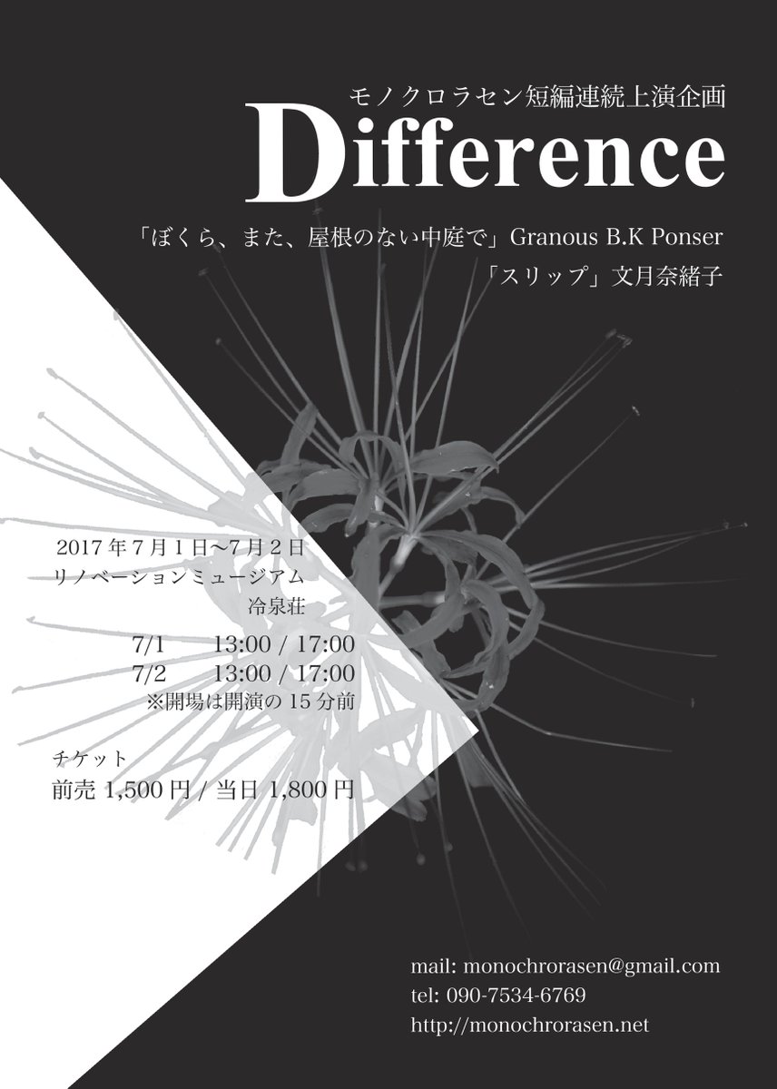 モノクロラセン短編連続公演 「difference」 「ぼくら、また、屋根のない中庭で」Granous B.K Ponser 「スリップ」文月奈緒子 7/1 13:00 /17:00 7/2 13:00 /17:00 会場:冷泉荘 料金:前売 1500円 / 当日1800円
