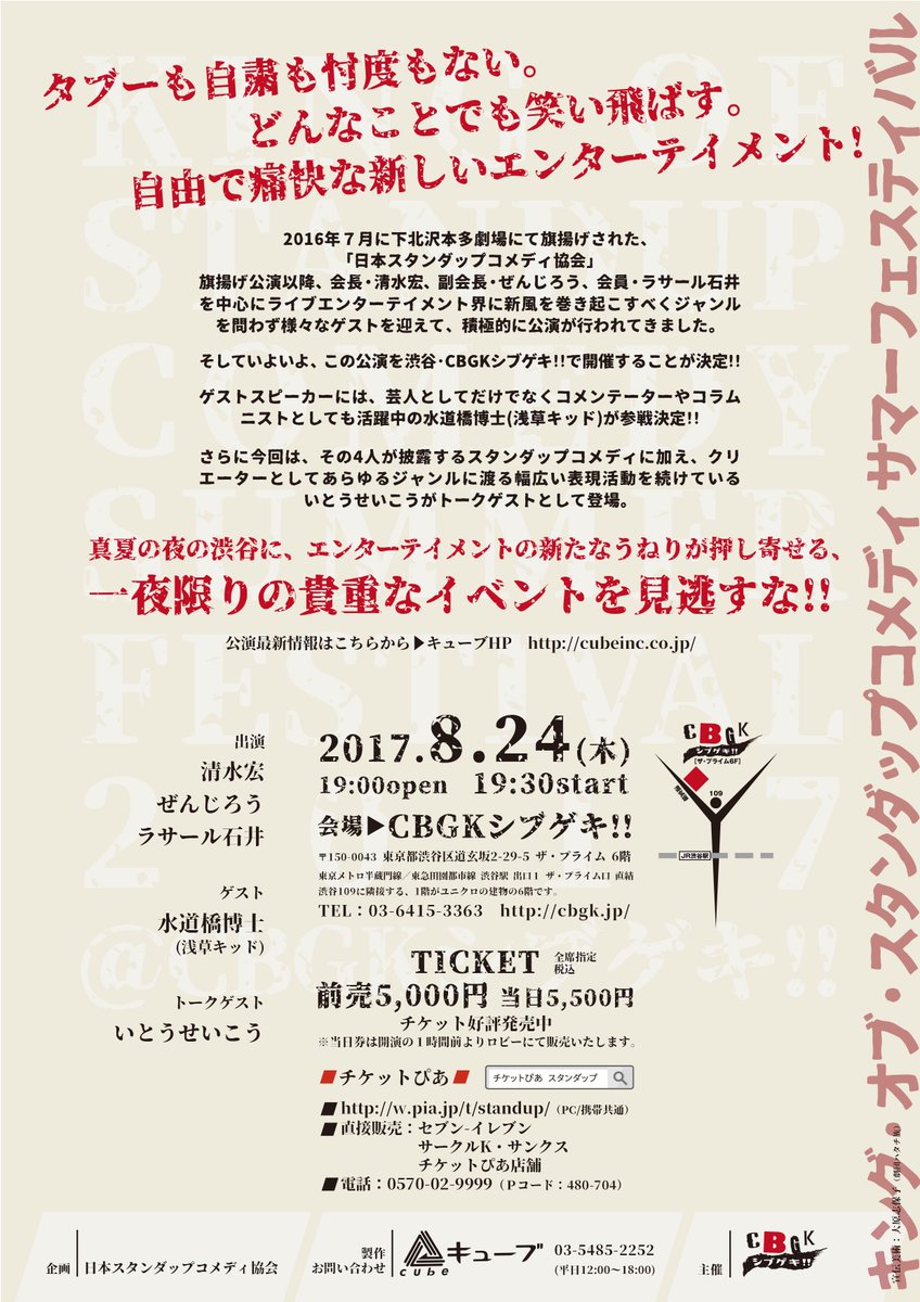 【CBGKシブゲキ!!企画】 8/24 19:30開演『キング・オブ・スタンダップコメディ〜サマーフェスティバル2017@CBGKシブゲキ!!〜』 出演:清水宏、ぜんじろう、ラサール石井/水道橋博士 トーク対談ゲスト:いとうせいこ… https://t.co/tf6sViwGgS