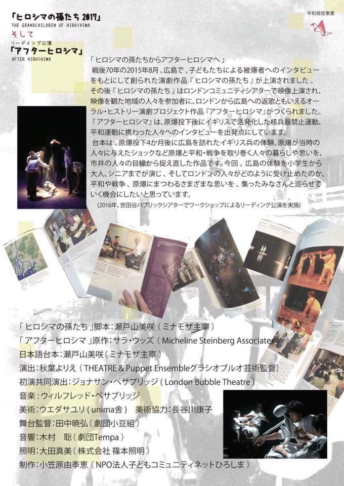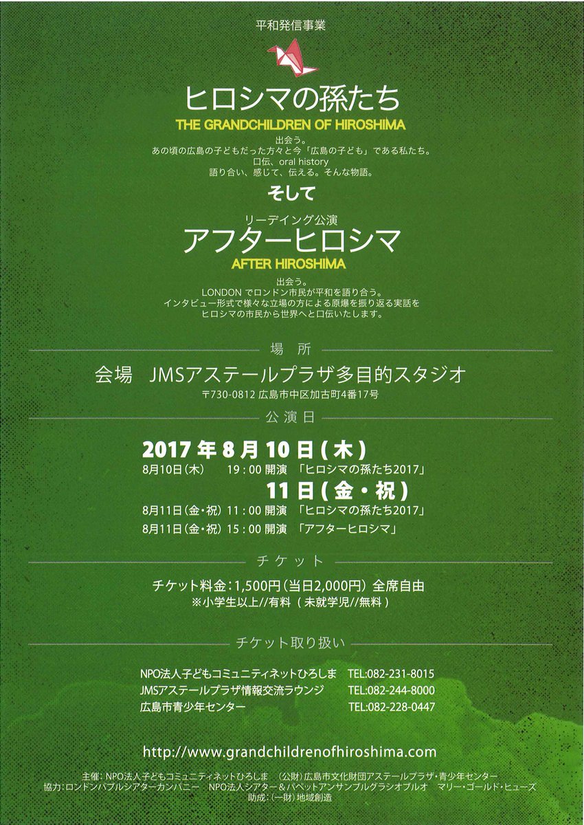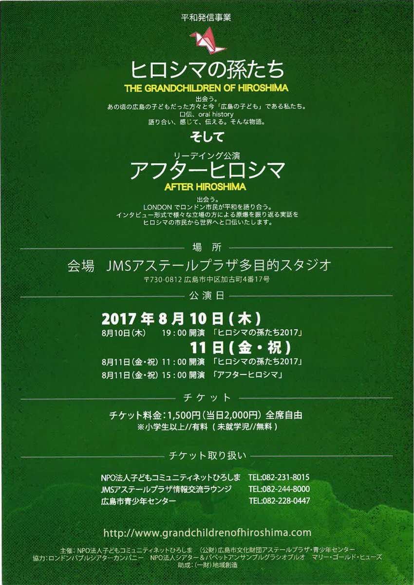 32. 「ヒロシマの孫たち2017」「アフターヒロシマ」〔場所〕JMSアステールプラザ多目的スタジオ〔チケット料金〕1500円/当日2000円〔公演日やチケットの取り扱い等 詳しくは画像またはHPを参照〕是非観に行ってみて下さい。 https://t.co/lwFcVqKMOd