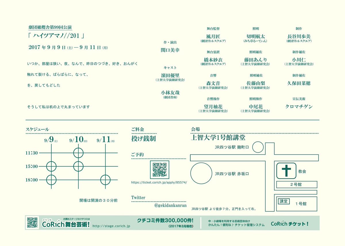【折り込み情報】 9月9日(土)から11日(月)まで上智大学1号館講堂にて上演します、劇団橄欖舎(@gekidankanran )様『ハイツアマノ//201』の当日パンフレットに次回公演『みつめのあまひめ』の本チラシを折り込ませていただきました。是非ご覧ください。