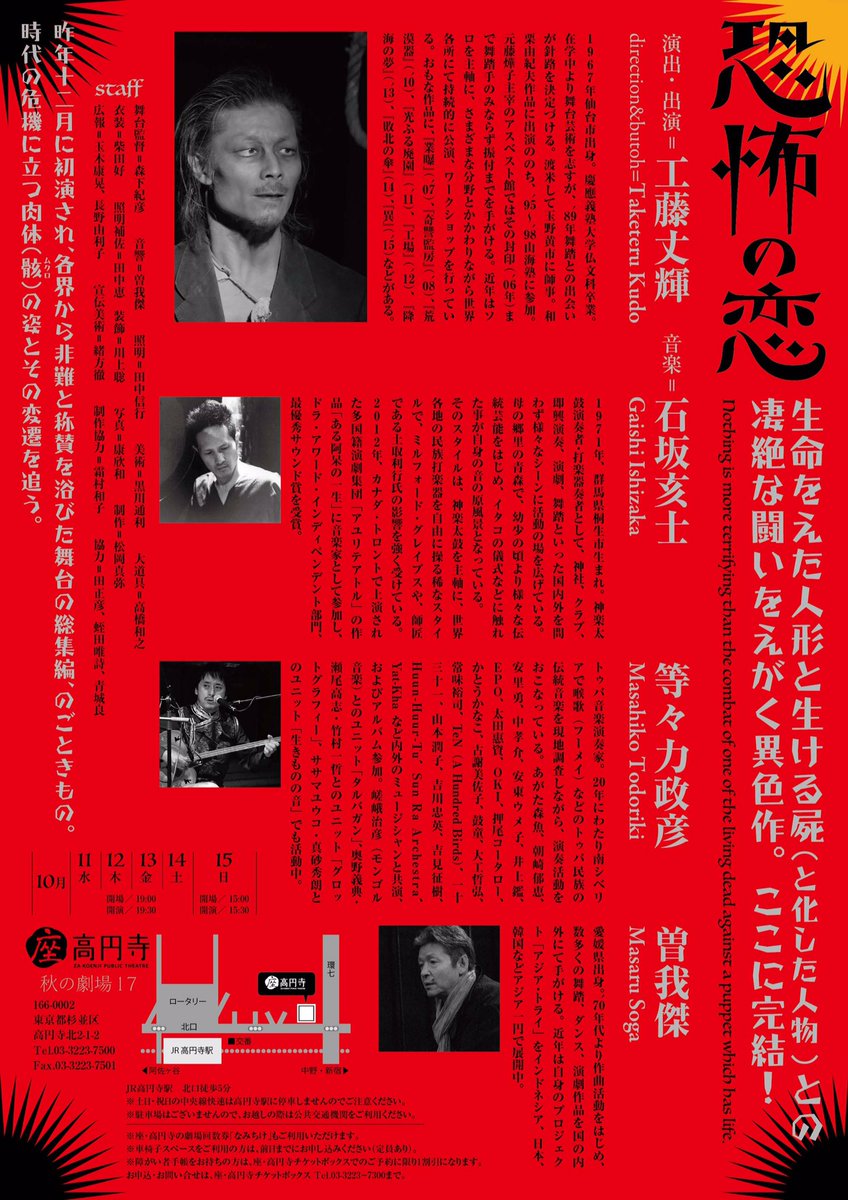 | スタッフ | 音楽:石坂亥士、等々力政彦、曽我傑 舞台監督:森下紀彦 音響:曽我傑 照明:田中信行 美術:黒川通利 大道具:高橋和之 衣装:柴田好 照明補佐:田中恵 装飾:川上聡 制作:松岡真弥 制作協力:霜村和子 協力:田正彦、蛭田唯詩、青城良 主催:東京戯園館 後援:杉並区 提携:NPO法人劇場創造ネットワーク/座・高円寺 |