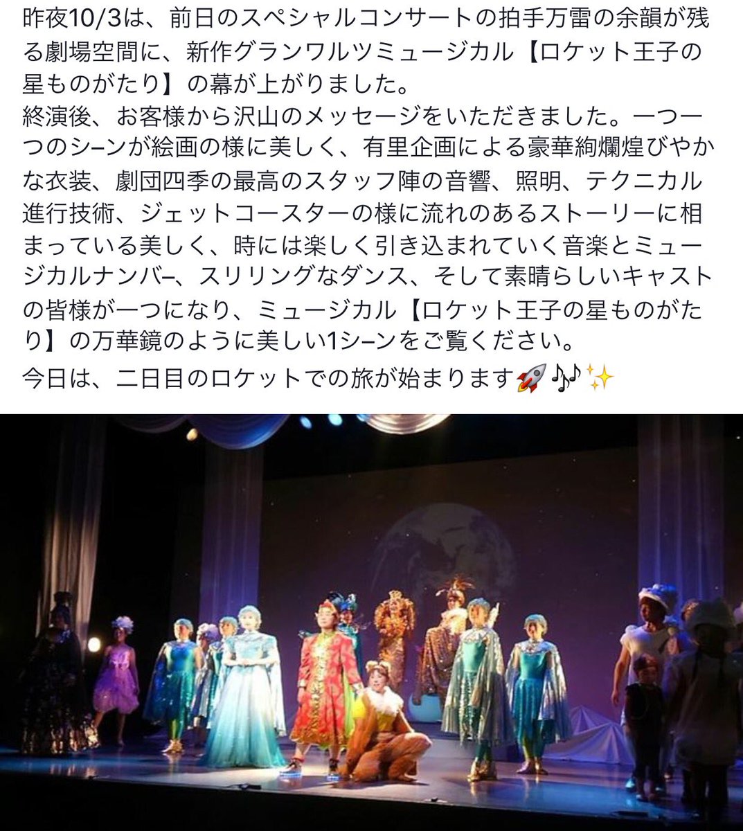 明日10月3日銀座博品館にて、[ロケット王子の星ものがたり]の舞台が公演されます! エンディング曲を僕が作曲させて頂きました。元劇団四季の方達の歌は本当に圧巻です! https://t.co/rcKHJME0FB https://t.co/BF8dYof5K2
