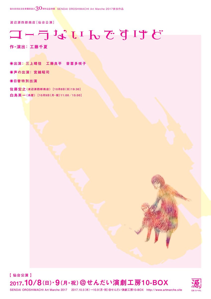 ●2017/10/3 今週の公演 渡辺源四郎商店 『コーラないんですけど』仙台公演 10月8日(日)、9日(月) せんだい演劇工房 10-BOX box-1 https://t.co/09b1e2WLsf https://t.co/8UIBcDPZZ6 #おろシェ