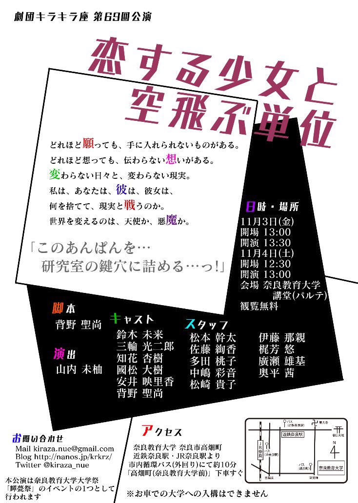 【2017/11/03金 13:30-】[奈良県/奈良市高畑町]奈良教育大学▽劇団キラキラ座 第69回公演「恋する少女と空飛ぶ単位」▽https://t.co/51A7wOUSHc(-11/04)
