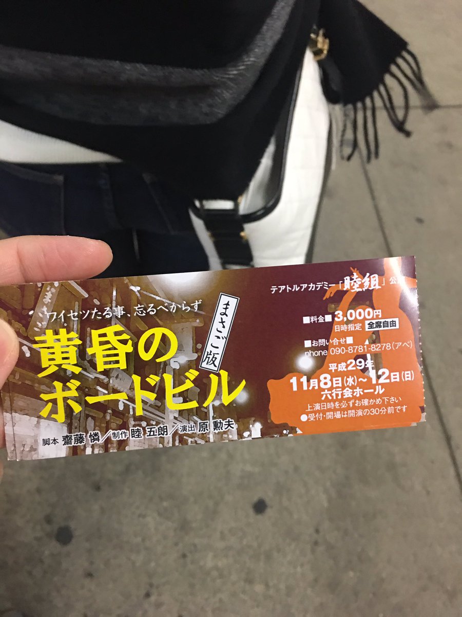 友人が出演している、睦五朗先生の演出舞台を見てきました。 黄昏のボードビル。戦争や地震によって翻弄される人間ドラマ。 素敵な作品でした。 私もこんな舞台に立ってみたい https://t.co/XGQJLMpHKi