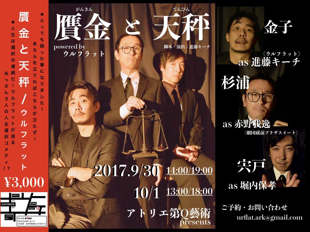 ウルフラット新作告知! 「贋金と天秤」 <日程>2017.9/30&10/1 <場所>アトリエ第Q芸術 <料金>¥3,000 詳しくはコチラ↓ https://t.co/qvL8VxfAdp