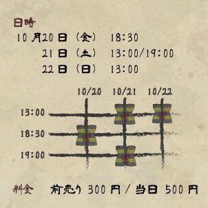 【2017/10/21土 13:00-/19:00-】[京都府/近衛殿北口町]同志社大学新町別館小ホール▽同志社小劇場 10月引退公演「ゲゲゲのげ ~逢魔が時に揺れるブランコ~」▽https://t.co/hI3kooMVzl(-10/22)