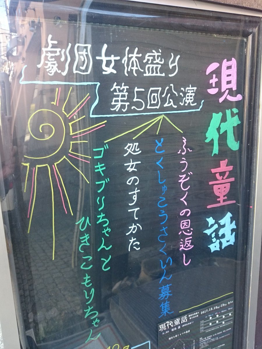本日から小屋入りしました! 宜しくお願いします! 劇団女体盛り 第5回公演 『 現 代 童 話 』 ~ ふうぞくの恩返し ~ ~ 処女のすてかた ~ ~ とくしゅこうさくいん 募集 ~ ~ ゴキブリちゃんとひきこもりちゃん… https://t.co/g37ooLd6GK
