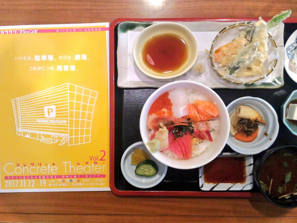 今回は海鮮丼と野菜天とコンクリ2。大満足です♪ https://t.co/lvdONWaVqZ #浜松 #演劇 #劇団 #コンクリ2 #コンクリートシアターvol2 #11月12日から19日まで #万年橋パークビル #カラクリマシーンズ #絡繰機械