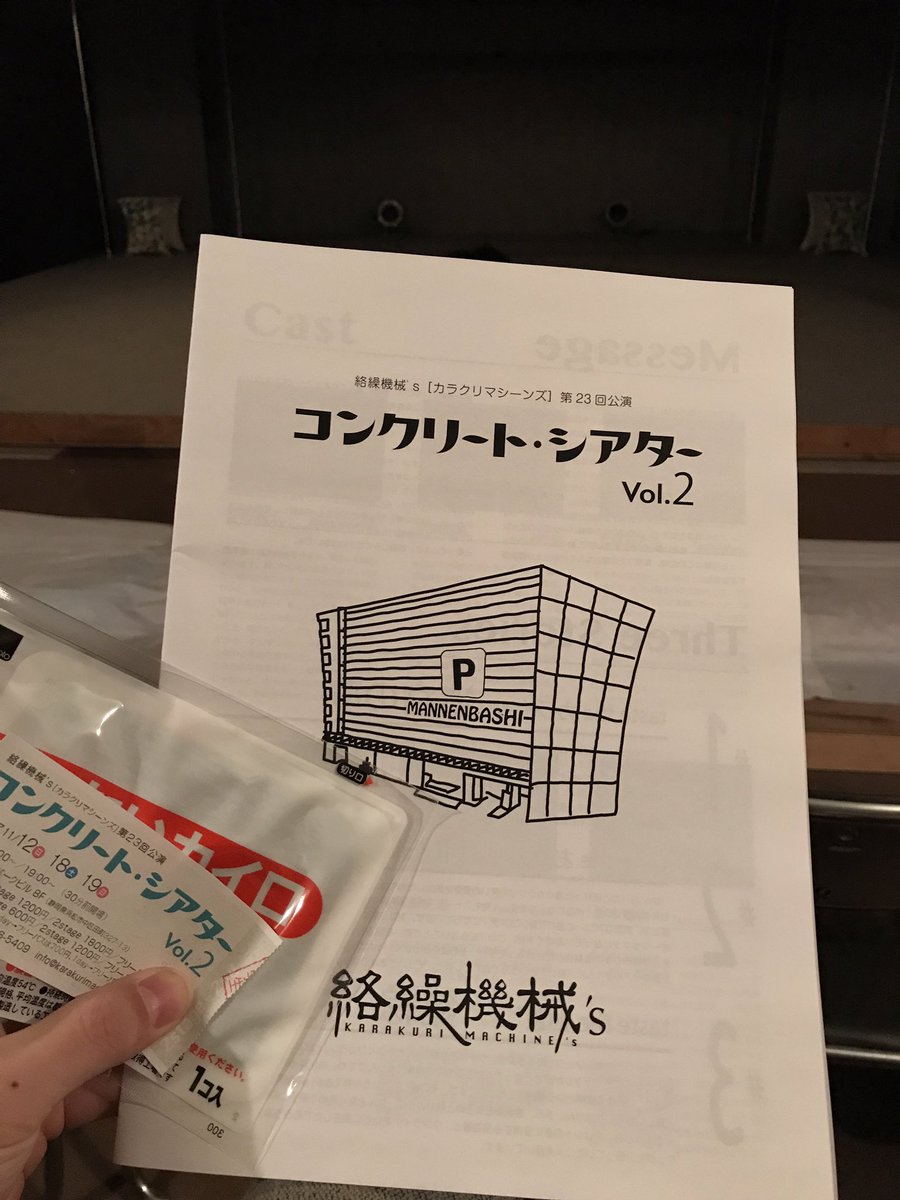 絡繰機械‘s 公演『コンクリートシアターvol.2』を観に行く。 この劇団の持つ美術性や役者の動きはとても面白い。 ただ、前回公演と雰囲気の近いお芝居で、コメディータイプのRush!が見れなかったのが残念。 https://t.co/9HKc9hAoWs