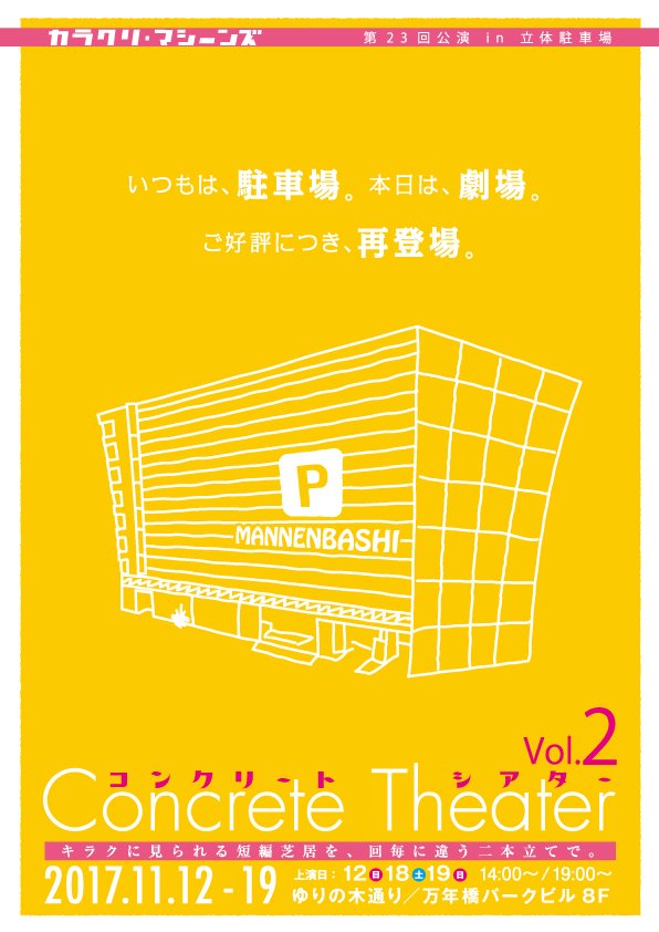 本日11月19日(日)絡繰機械’s公演「コンクリートシアターVol.2」 万年橋パークビル8Fにて、ラスト2回上演です。 14:00、19:00です。見なきゃ損です。お見逃しなきように。 https://t.co/JqANrm7Qiy
