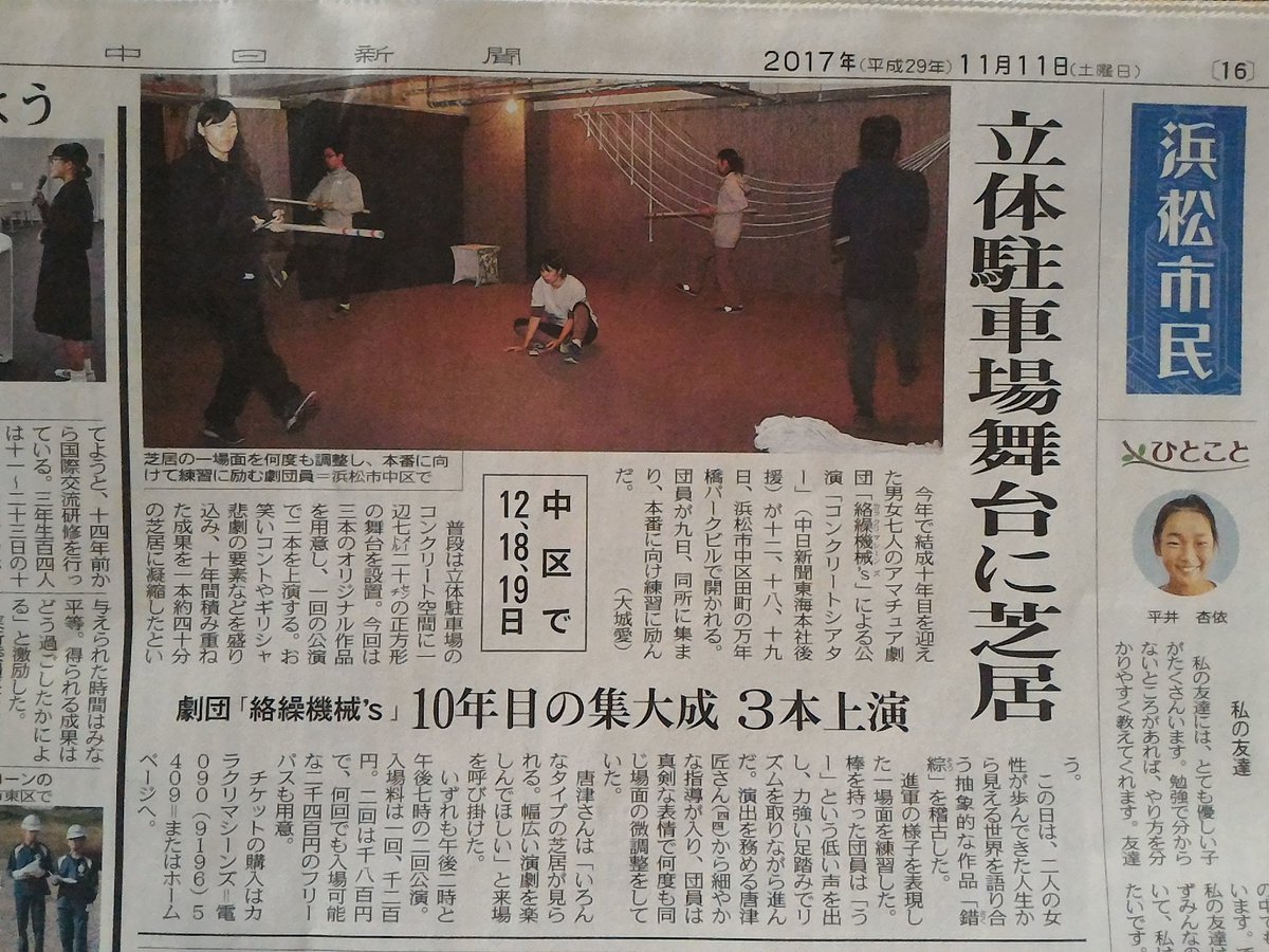 中日新聞さんに取り上げていただきました!ありがとうございます。いよいよ明日が初日です。皆様のご来場心待ちにしています。 https://t.co/SZ64PT3sbJ #コンクリ2 #コンクリートシアターvol2 #浜松 #演劇 #劇団 #カラクリマシーンズ #絡繰機械