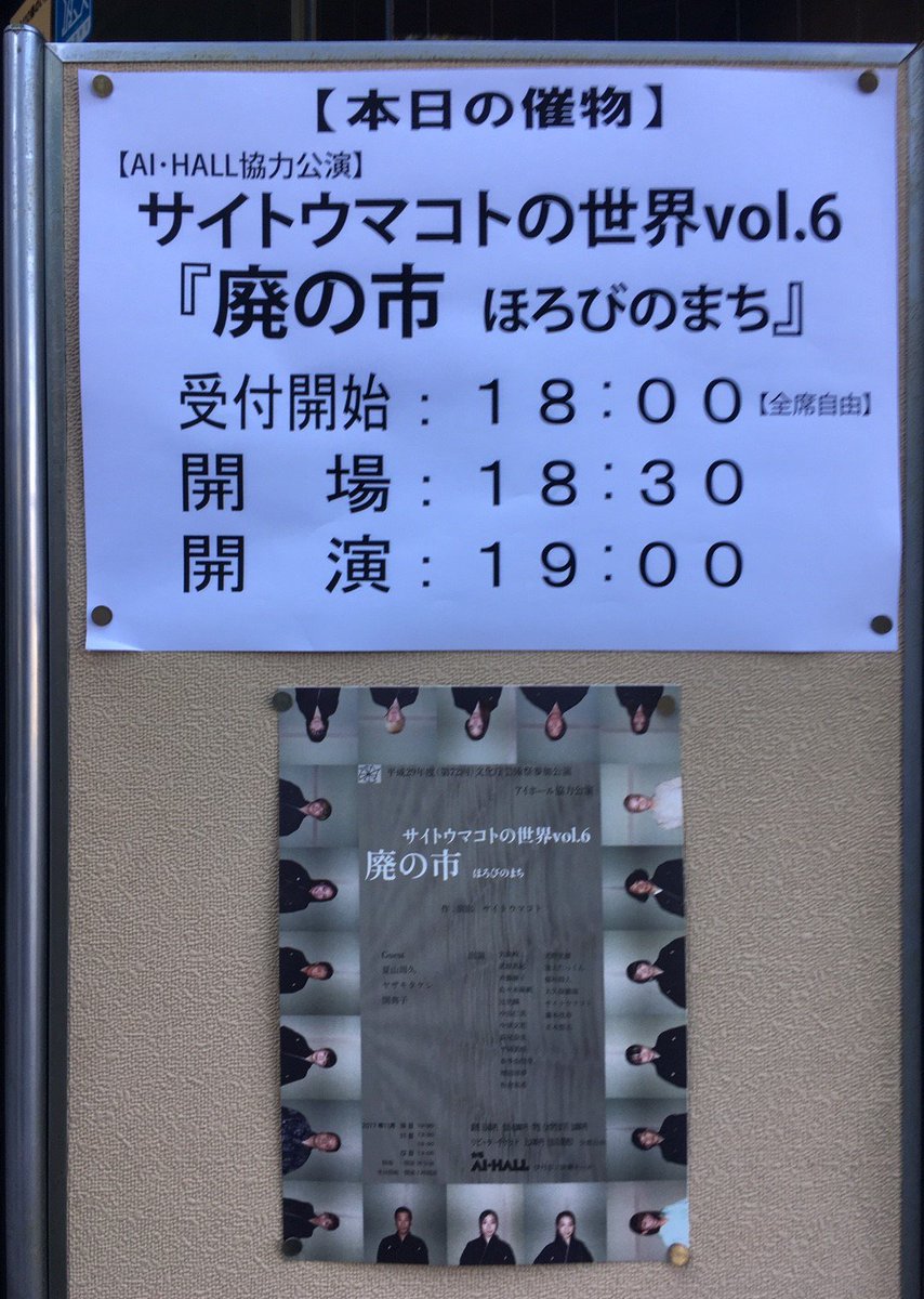 今週末伊丹アイホールで上演されるサイトウマコトの世界、にチラシを挟み込みに行かせていただきまして。 ポスターがアイホールのロビーにドーンとありました^_^ https://t.co/v1qfNybmR5