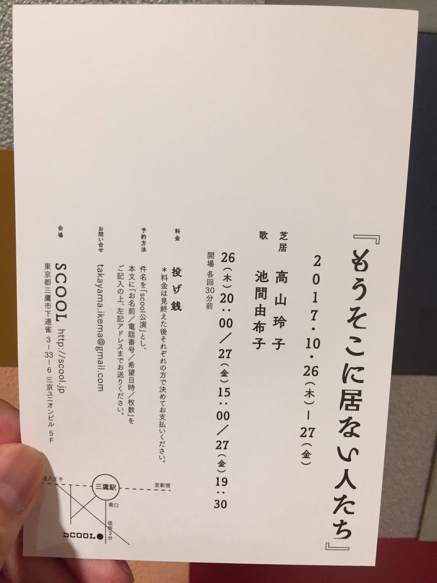 もう来週です。 届くかな、お待ちしてます! 『もうそこに居ない人たち』 26日(木) 20:00 27日(金)15:00/19:30 高山玲子 芝居 池間由布子 歌 三鷹SCOOL… https://t.co/mlRTPbyYfN