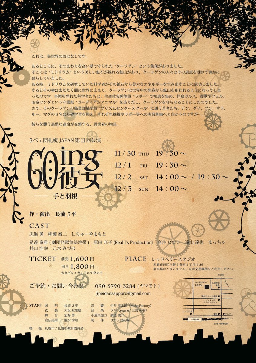 3ペェ団札幌JAPAN第11回公演 『GOing彼女―手と羽根―』作・演出:長流3平 11月30日(木)~12月3日(日) レッドベリースタジオ/八軒2条1丁目1-26 前売:1600円 これは異世界のお話です。あるところに、その… https://t.co/hAuP8CtVN9