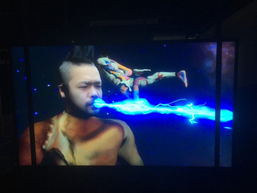 30. Asian Art Award contact gonzoの作品。 天井が低く暗い通路で強風を浴びながら、バカっぽいCG映像を見る。これは好き。 https://t.co/Ua9RvZaa5S