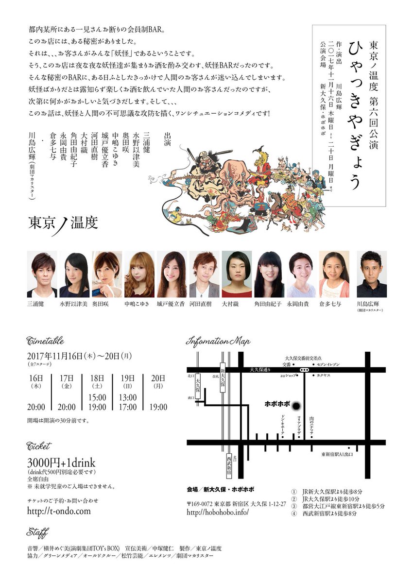 さあ! 本日も東京ノ温度公演『ひゃっきやぎょう』がございます! 13時と17時の二回公演です! 予約受付中!当日券もあります! 明日で終わってしまいます!お見逃しなく!! https://t.co/6KLaHVqUYq