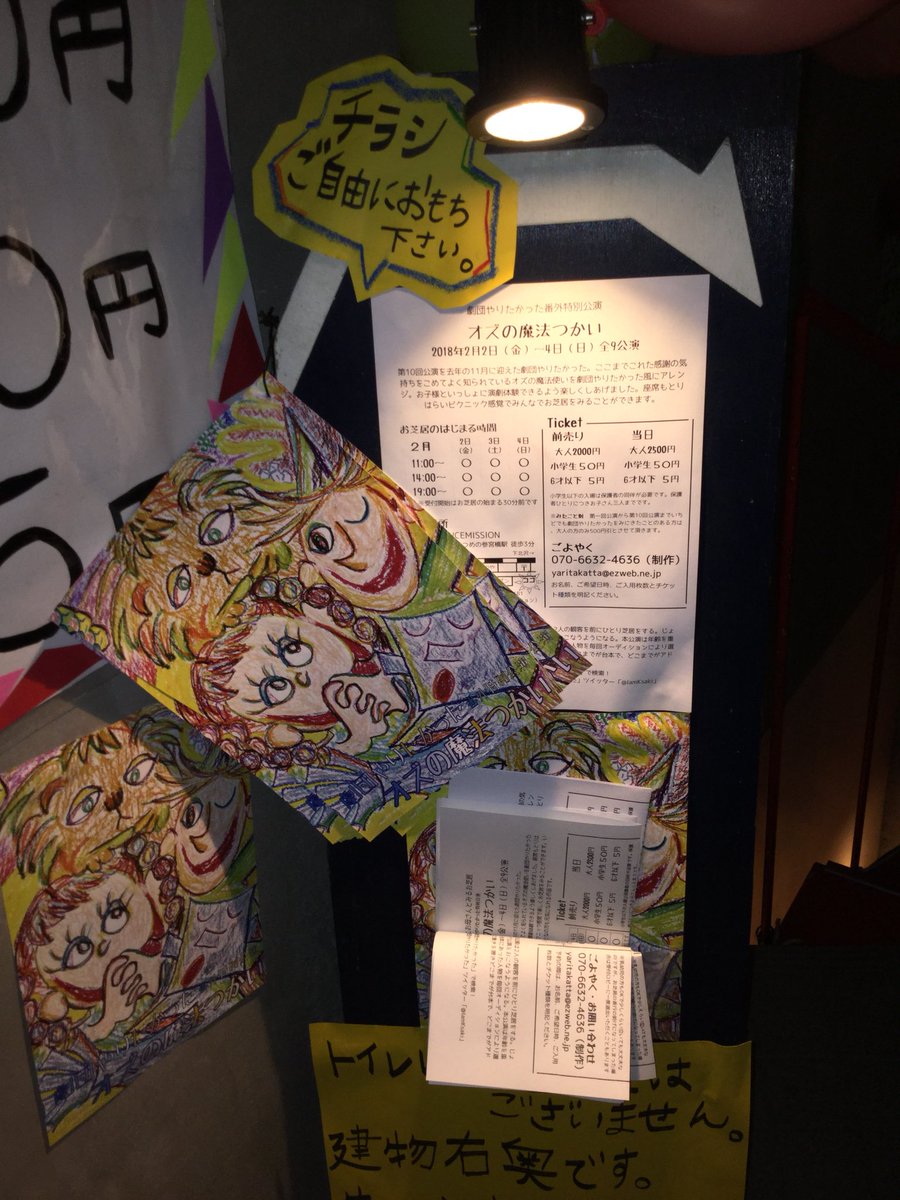 | 説明 | 公演10回を迎えた記念としての番外特別公演です。 オズの魔法つかいを劇団やりたかった風にして、2/2~2/4の9公演です。 お子さんを連れての観劇もOKです。小学生50円、6才以下は5円です。受付のお姉さんに手渡ししてください。大人は前売り2000円ですが、第10回までこれたことの感謝の気持ちをこめて今まで一度でもやりたかったの公演を見た方には500円引きとさせていただきます。 |
